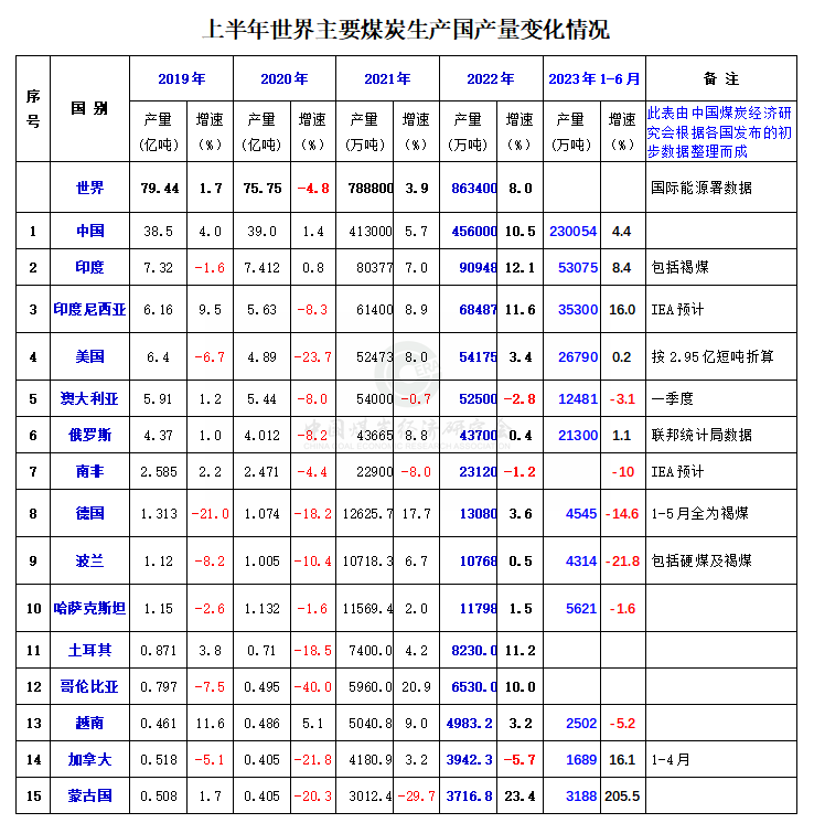 2023年上半年世界主要煤炭生產(chǎn)國產(chǎn)量變化情況