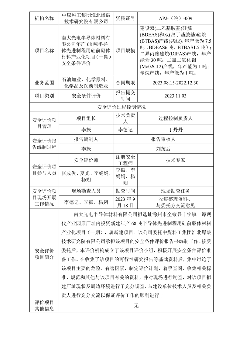 南大光電半導(dǎo)體材料有限公司 年產(chǎn)68噸半導(dǎo)體先進(jìn)制程用硅前驅(qū)體材料產(chǎn)業(yè)化項(xiàng)目(一期)安全條件評(píng)價(jià)